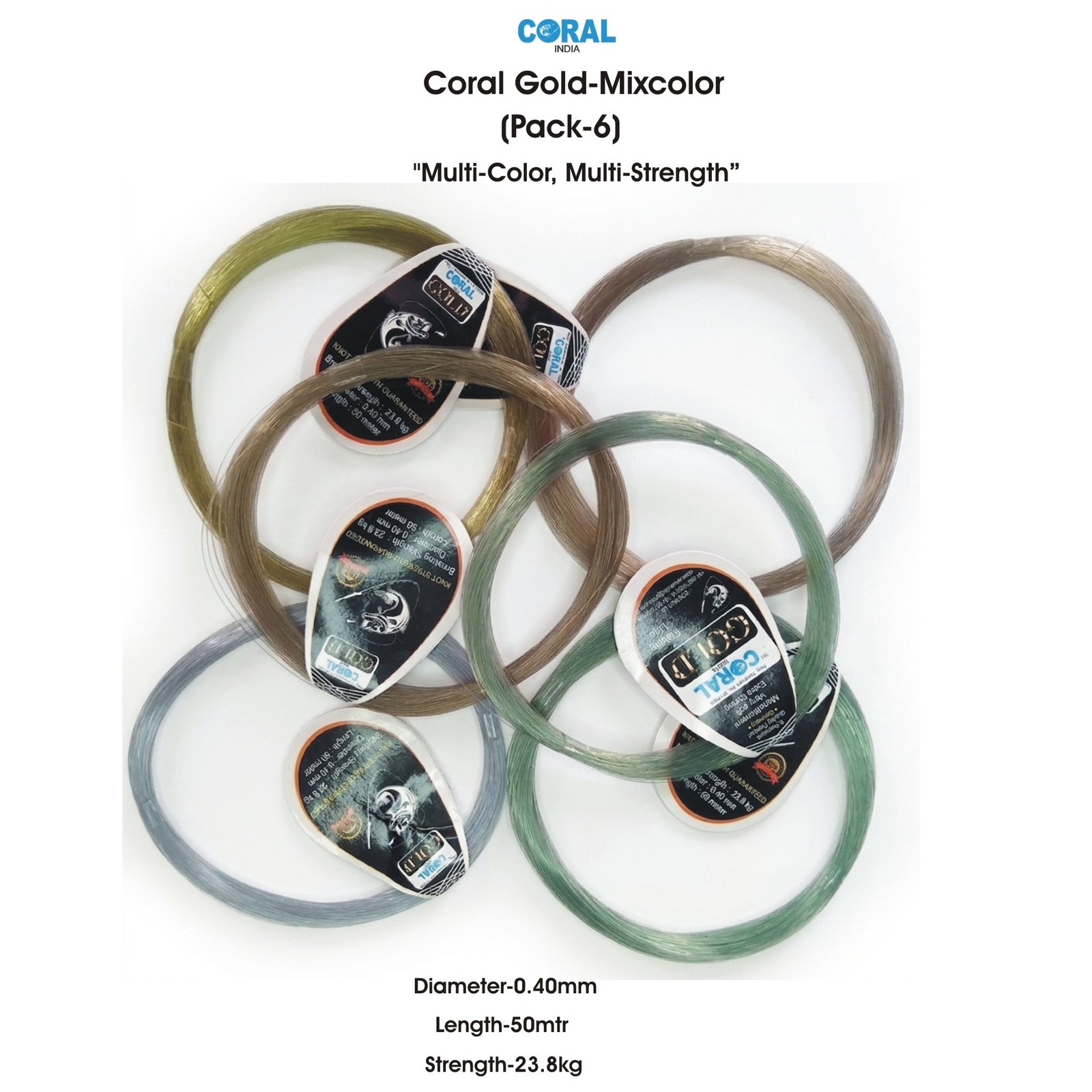 Upgrade your fishing gear with the Coral Gold-Mixcolor Monofilament Fishing Line. This premium pack of 6 offers maximum versatility for every angler, featuring a variety of colors designed to blend seamlessly into different water environments—from crystal clear lakes to murky riverbeds.