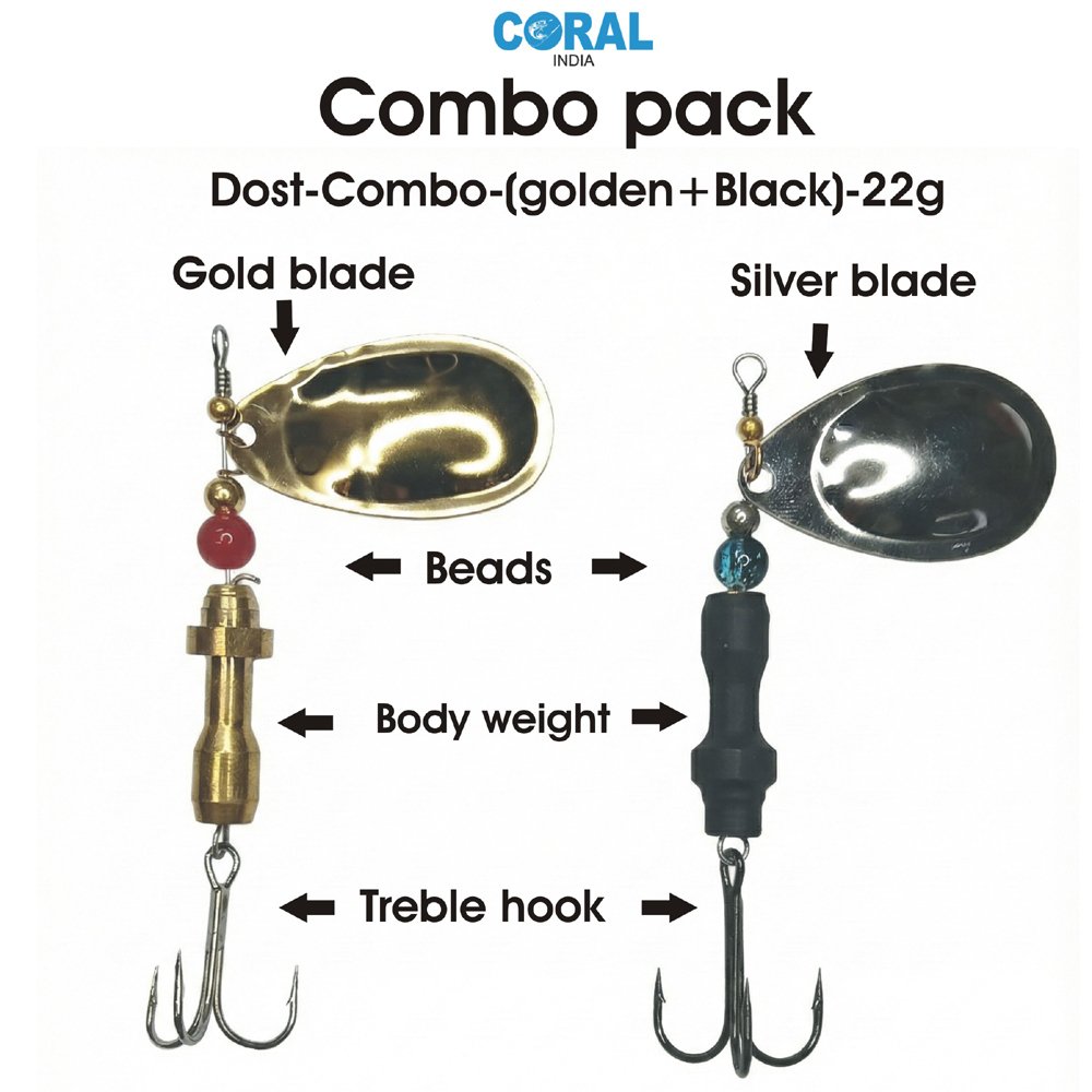 Elevate your angling game with the Coral India Dost-Combo. Engineered for precision and durability, this premium spinner set is a must-have for every fishing enthusiast. The combo features two distinct color profiles—Classic Gold and Tactical Black—ensuring you are prepared for any water condition.