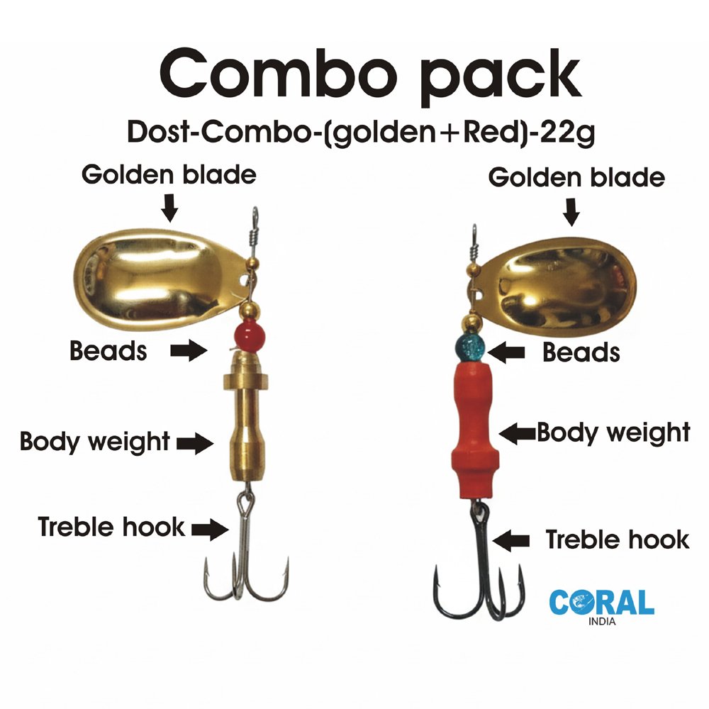 The Coral India Dost-Combo is a high-performance fishing kit designed for serious anglers who target large predatory fish. This combo pack features two uniquely designed 22g spinners: one with a sleek Golden brass body and another with a vibrant Red textured body.