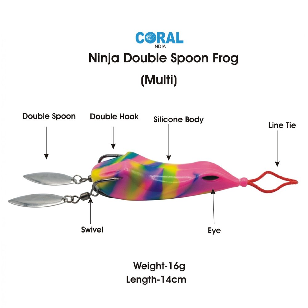 Take your topwater fishing to the next level with the Coral India Ninja Double Spoon Frog. Designed specifically for aggressive predator fish like Snakehead (Murrel) and Barramundi, this lure combines the natural movement of a frog with the added attraction of spinning spoons.