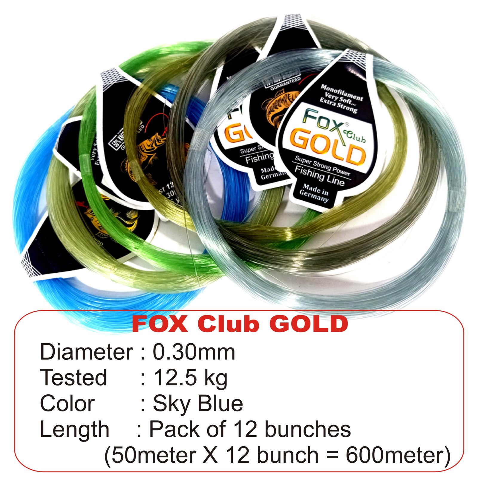 Fox Fishing Line –Diameter: 0.30mm , Breaking Strength: 12.5kg (50m x 12Pack)=600 meter