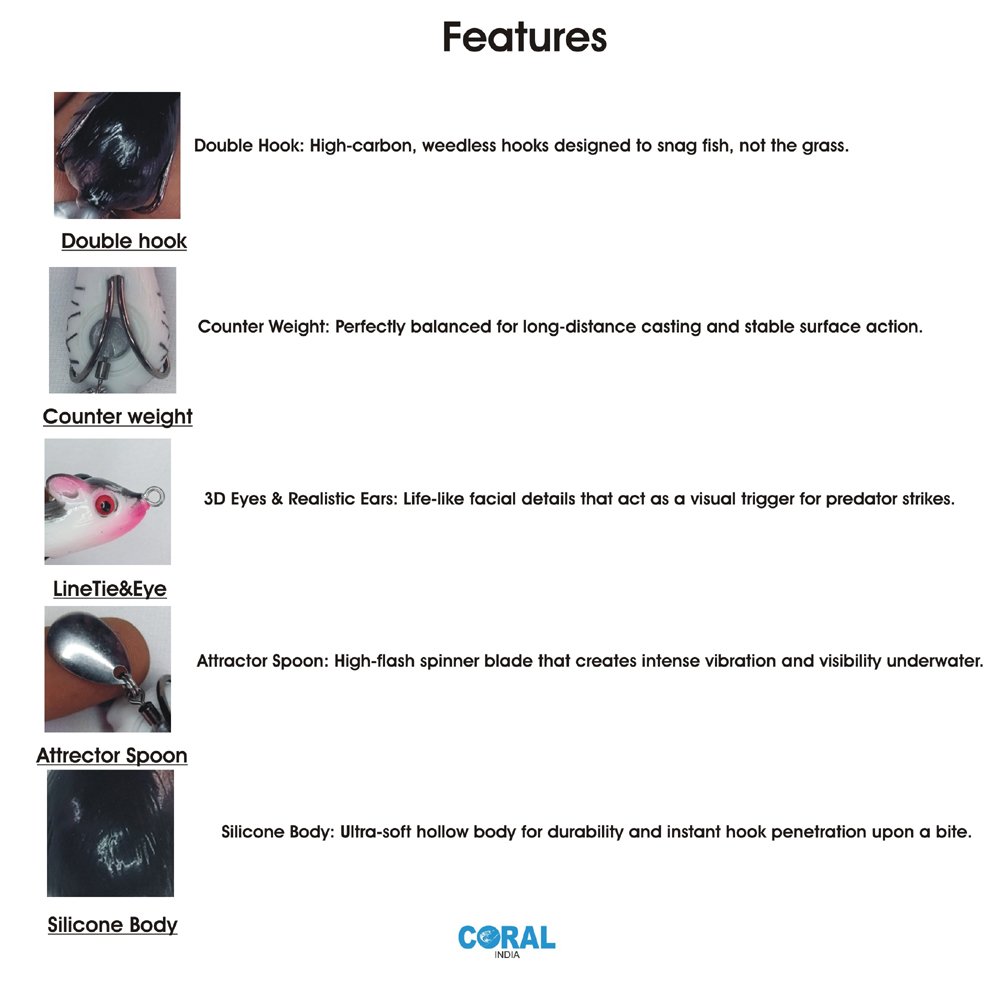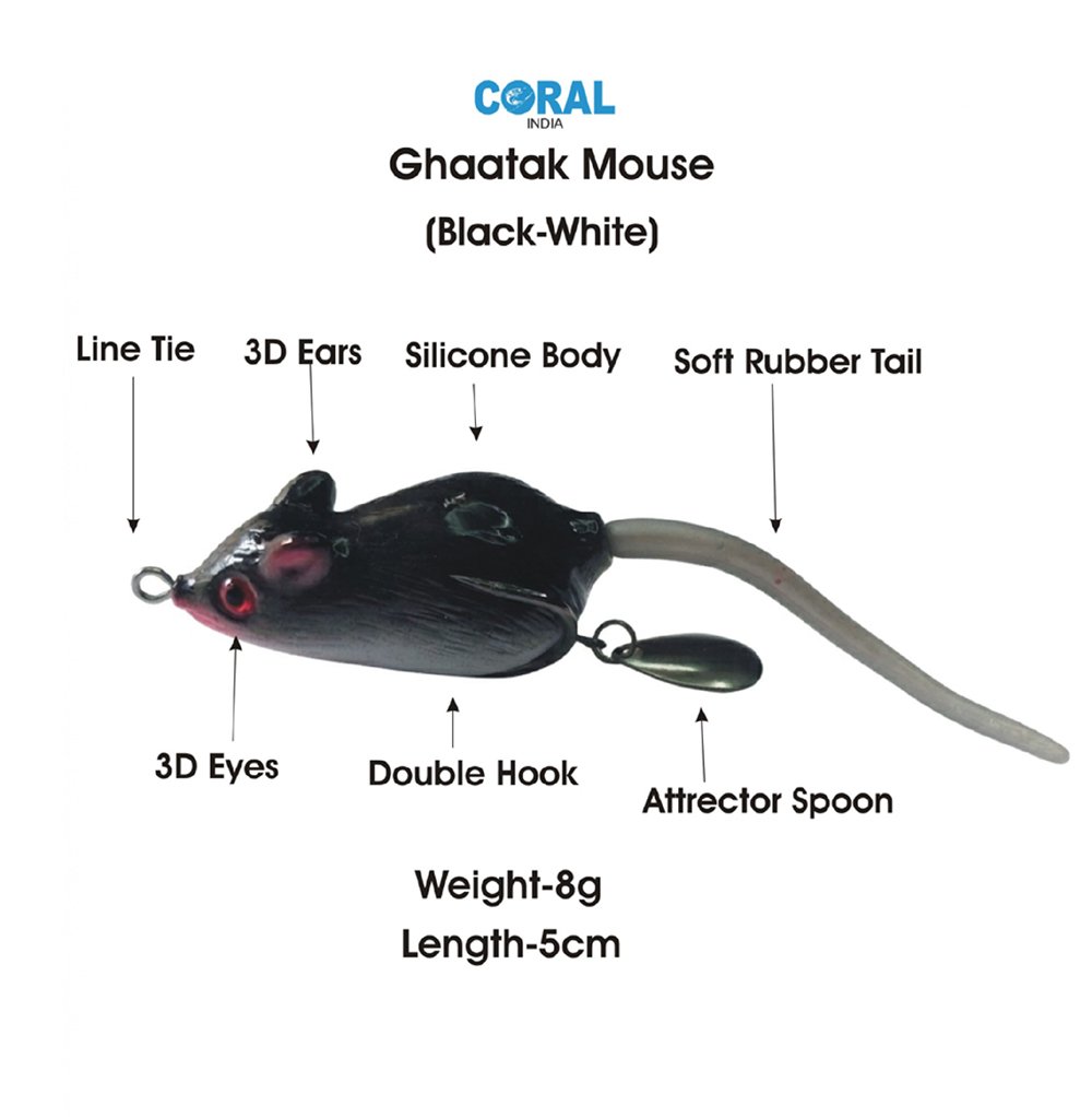 Level up your topwater fishing game with the Ghaatak Mouse by Coral India. Engineered for high performance, this lure is designed to mimic the exact movement of a real mouse, making it irresistible to predatory fish like Snakehead, Mahseer, and Wallago. Its sleek black-and-white contrast ensures high visibility in various water conditions.