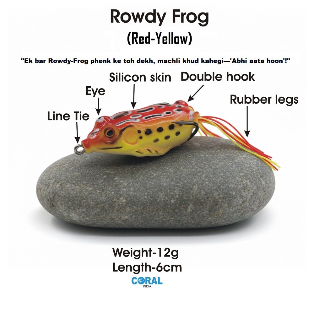 Take your angling game to the next level with the Coral India Rowdy Frog. Specifically designed for topwater action, this lure is a predator’s nightmare. Featuring a striking Red-Yellow high-visibility pattern, it is engineered to trigger aggressive strikes from species like Snakehead (Murrel), Bass, and other freshwater predators.