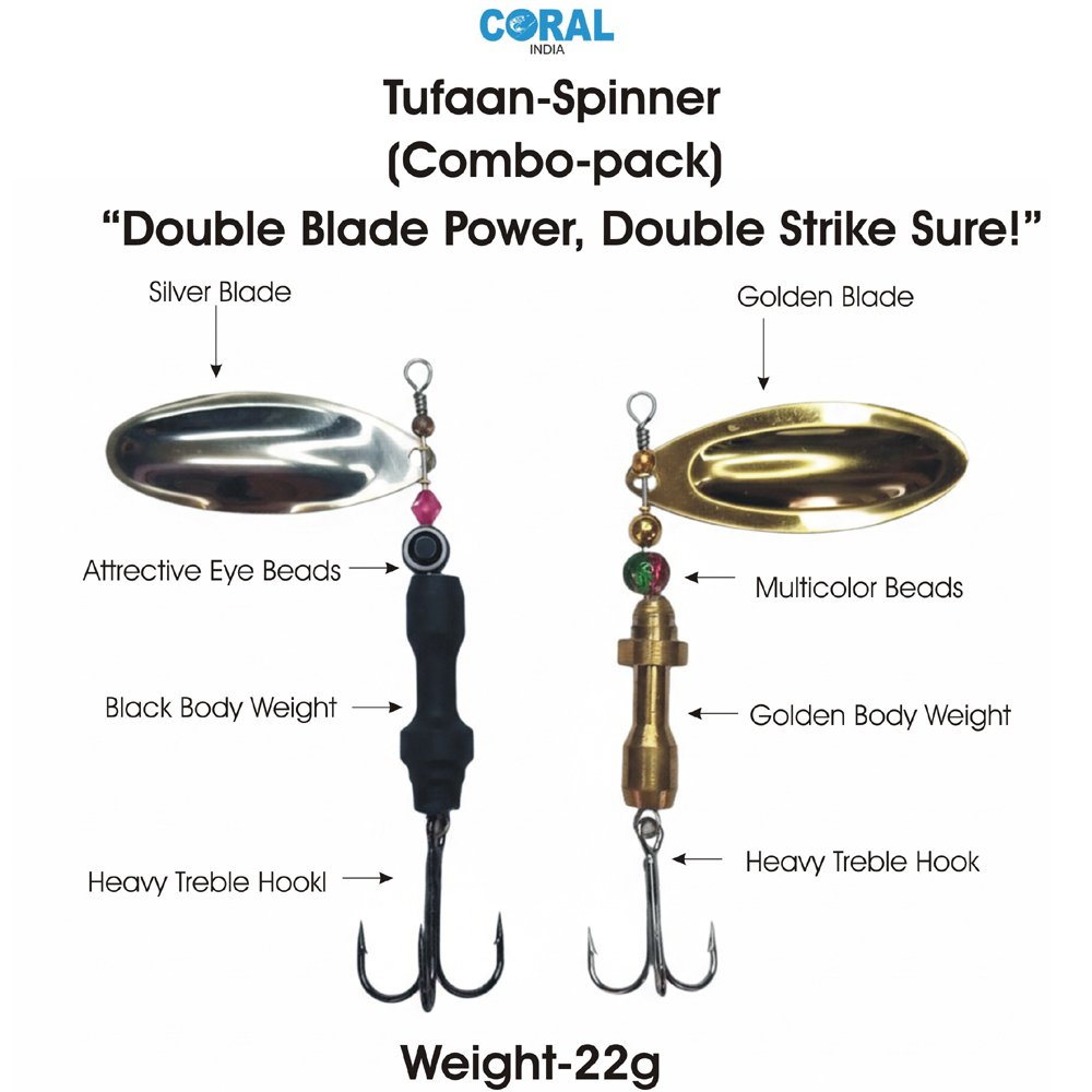 Each 22g lure is precision-weighted for long-distance casting, making them the ultimate choice for targeting large predators like Snakehead, Rohu, and Wallago Attu. The high-speed rotation of the blades creates massive underwater vibrations and flash—a literal “Tufaan” (Storm) that triggers aggressive strikes from a distance. Whether you are fishing in murky rivers or clear lakes, this combo provides the versatility you need to dominate the water.